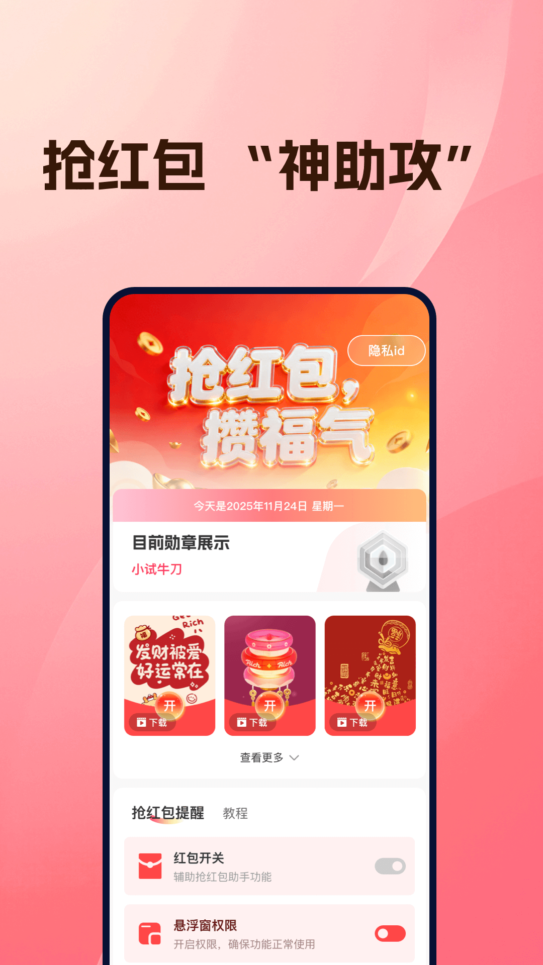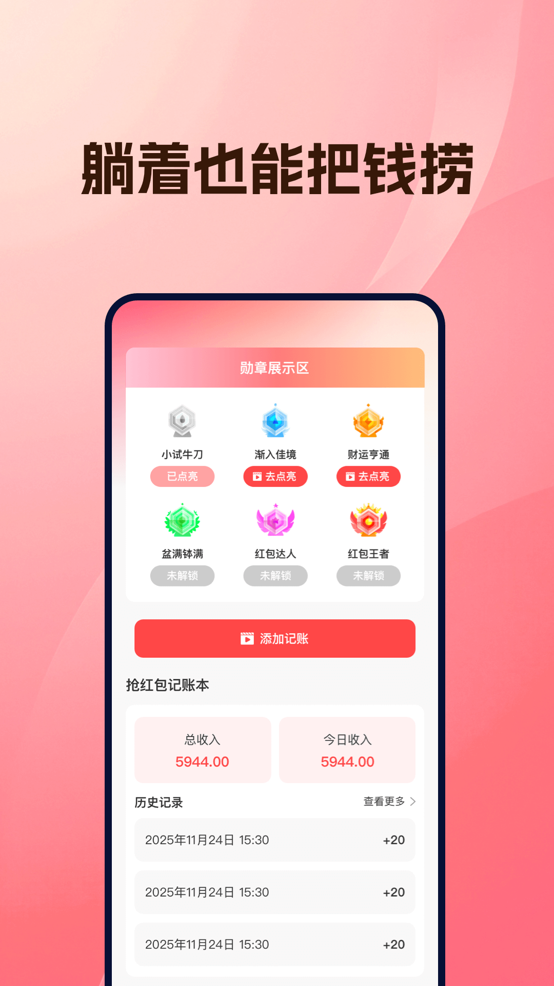 开门抢红包,记账获勋章!这款APP不仅有实时红包提醒,让你不错过每一份惊喜,更有实用财封功能+创新荣誉账本——每记一笔账,都能累积总收入解锁专属勋章,记账也能有成就感,轻松记录红包数额,还能赢荣誉~